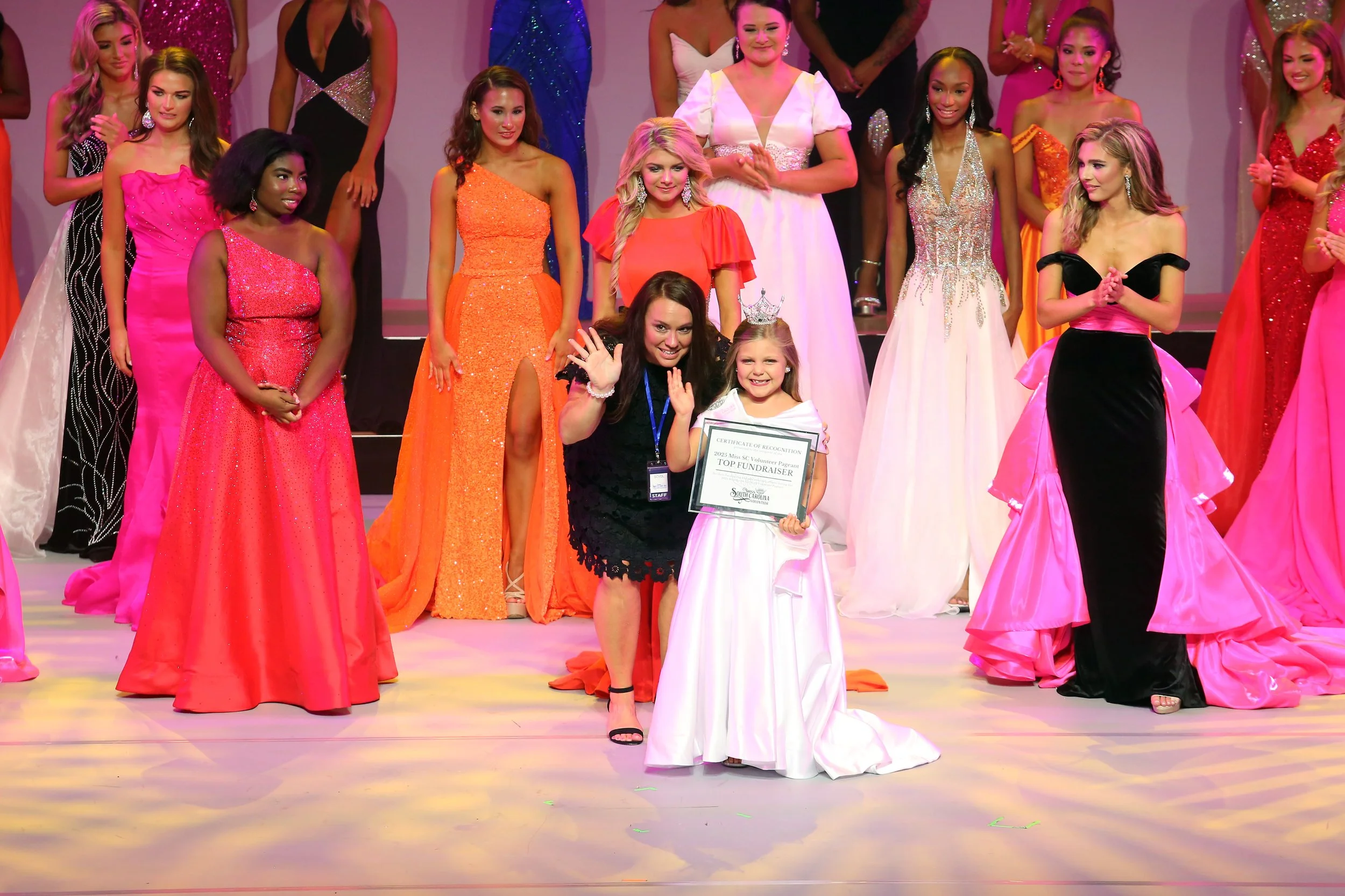 During pageant weekend, participants will have the opportunity to participate in fun activities specifically for them, as well as bonding activities with the contestants. Participants will also have their own production number and accompany their contestant onstage in the evening gown portion of the pageant.